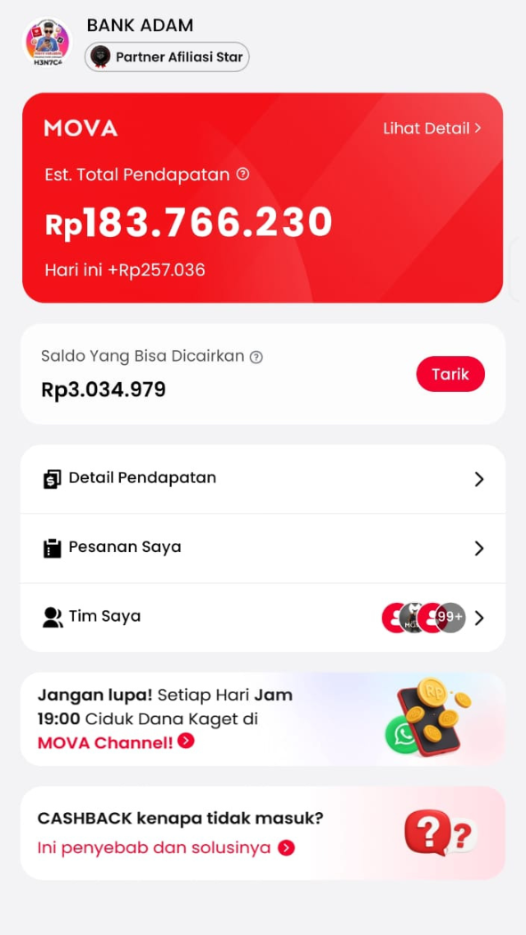 Cashback instan tiap belanja di Shopee, Tiktok, Lazada, Tiket.com, & Traveloka. Gabung MOVA Team, raih komisi pasif seumur hidup!